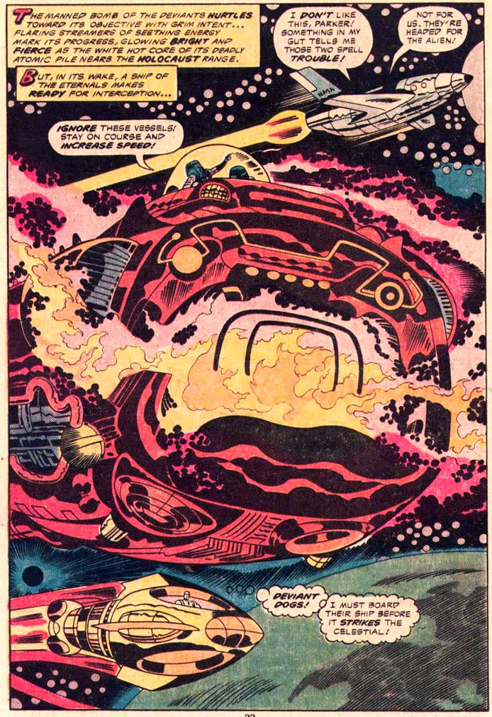 When the Deviants send a flying bomb to the ship of the Celestials, Sprite, an always-young Eternal who inspired Shakespeare's Puck, goes to the Forgotten One and enlists his aid. All the other Eternals are within the Uni-Mind, so with Sprite's help the newly clothed hero flies to intercept the kamikazi mission by the depraved Deviants. Also flying to the great ship is a space shuttle piloted by two American astronauts.